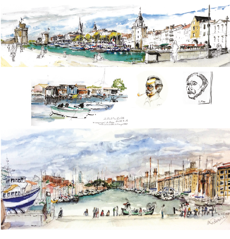 Mon dernier voyage est un tour de France dans les pas de Joseph Vernet qui au XVIIIe siècle a peint dix ports à la gloire de la Marine Française. J’ai retrouvé à quelques mètres près l’emplacement où J.V. se trouvait. Le résultat en est deux carnets Moleskine A5 et