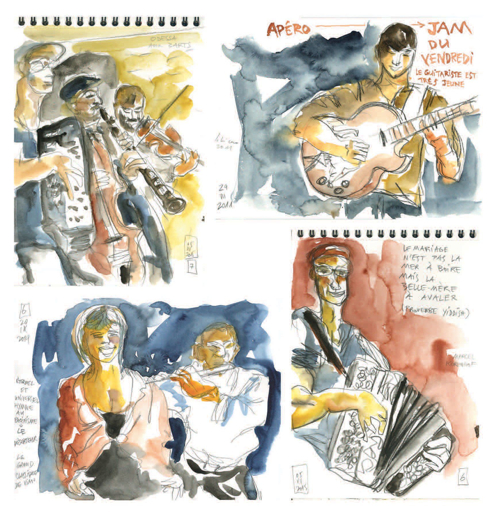 Quelques traits noircis sur le papier, des taches de couleurs, un peu d’eau, deux trois mots éparpillés, touche poétique et décalée, suffisent à rendre compte de l’énergie du concert, de l’engagement des musiciens, du rythme qui agite les esprits et les corps. Les dessins et aquarelles réalisés en direct témoignent de la volonté de saisir ce moment éphémère où la posture du musicien s’efface au profit de la seule intensité musicale et du tempo traduits sur le papier.